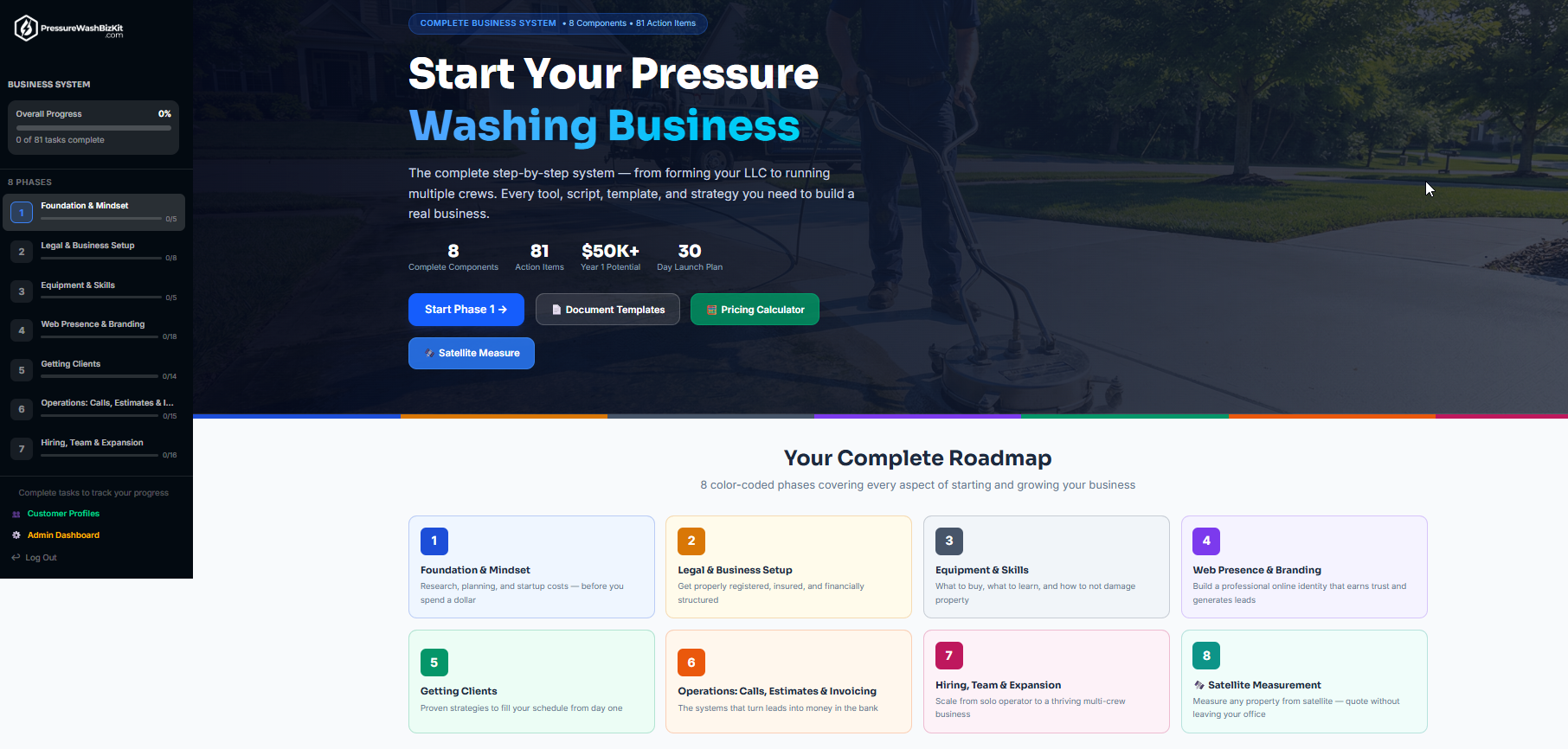 The Pressure Washing Business Starter Kit is not a PDF you download and forget. It is an interactive, step-by-step online system — 7 color-coded phases, 81 action items, a live pricing calculator, professional document templates, and word-for-word phone scripts. You work through it in order, check off tasks as you complete them, and always know exactly where you are and what comes next.